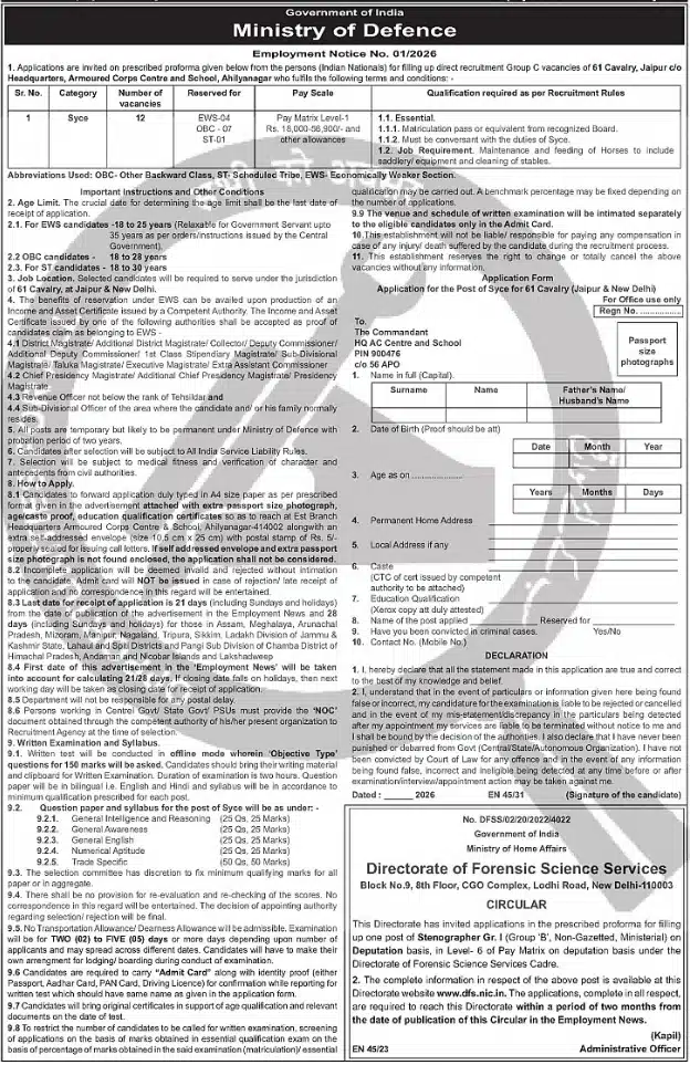 The Ministry of Defence Group C Recruitment 2026 has officially released Employment Notice No. 01/2026 for direct recruitment to Group ‘C’ Syce posts in 61 Cavalry, Jaipur under the Armored Corps Centre & School. Eligible Indian nationals can apply through offline mode within the prescribed deadline.